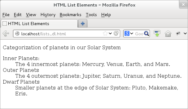 Now that we have seen examples of both ordered lists and unordered lists, let us see an example of definition list. Here we present list-based content such that the ordering is not important and also the data is in the term/definition format. Like the case of <li> elements, the closing tag for <dt> and <dd> are optional. If you feel cozier with the closing tags, feel free to add them!