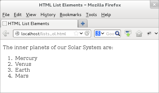We begin with an example of an ordered list. The example (given below) provides a list of inner planets of our Solar System. Here the ordering is important since we start by listing the planet closest to the sun, then the next, and so on. You might note that we keep the closing tag for the <li> element but as per the specification, it is optional -- so take your pick!