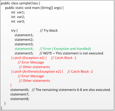 In general a super class can catch all the exceptions of its sub classes. So, when we have multiple catch blocks for a given try statement, we should place the sub-class (or specific Exception) first and then place the super-class (aka the Exception class). Accordingly, let us see an example that demonstrates this behavior. The following figure has a try block with two catch blocks, Catch Block-1 (ArithmeticException) and Catch Block-2 (Exception). Thus, if there is any arithmetic exception in the try block, then Catch Block-1 would be the one to catch it. For any other type of exceptions, it would be catch Block-2 that would handle them.